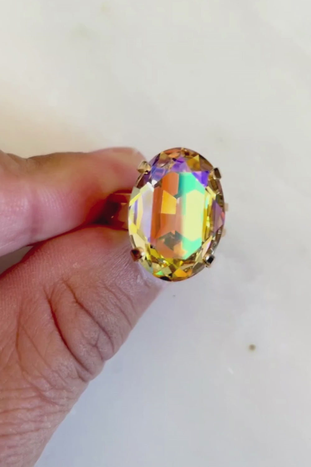 ¡Este impresionante anillo de cóctel de cristal seguramente llamará la atención! Un magnífico cristal ovalado de 18 mm está engastado en un lujoso anillo ajustable chapado en oro que se adapta a tamaños 5 en adelante. Esta gema de 12 quilates es perfecta para cualquier ocasión especial o para añadir un brillo llamativo a tu look diario. Cuando la luz lo refleja, el cristal brilla en tonos dorados, lavanda y verdes. La base del anillo no contiene níquel.