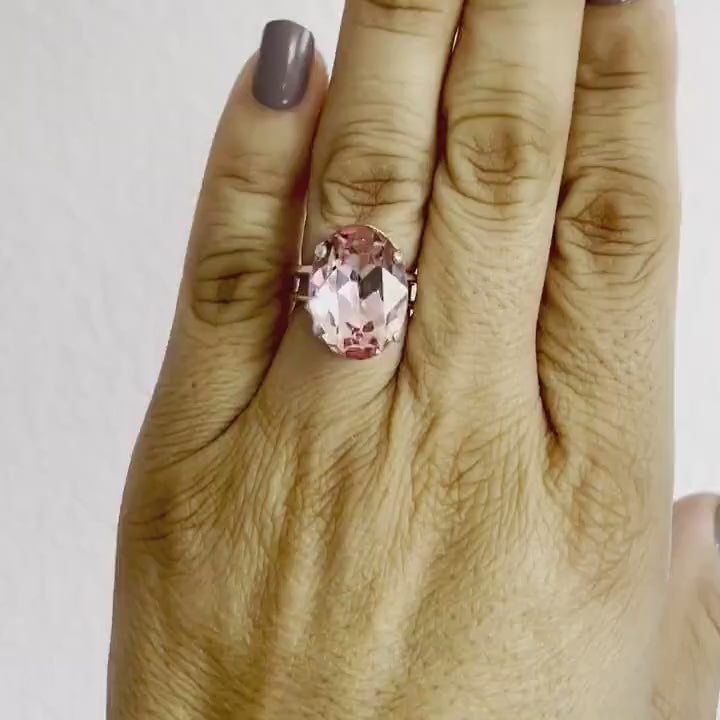 Esta brillante pieza de cristal que inicia una conversación irradia el brillo de Swarovski. Desde su óvalo rosa claro de 18 mm hasta sus 12 quilates de opulento brillo, este anillo ajustable chapado en plata (¡u oro!) está elaborado con precisión. Tamaño 5 o más grande, este impresionante accesorio añade un brillo seductor a cualquier ocasión, y todo sin níquel.