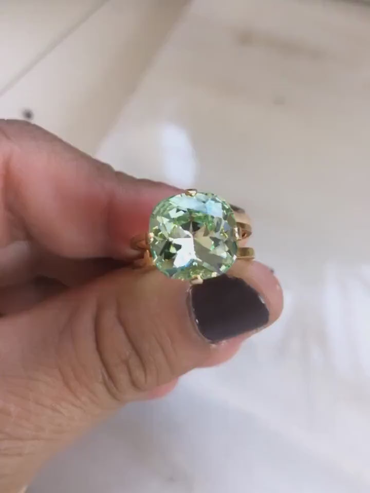 Este elegante anillo de cóctel de cristal llama la atención. He colocado un gran cristal de talla cojín cuadrado de 12 mm en un anillo ajustable chapado en oro (aproximadamente el tamaño cinco como mínimo y será más grande a partir de ahí). La gema de casi siete quilates es perfecta para una ocasión especial o para el día a día. El tono es un verde claro llamado crisólito. La base del anillo no contiene níquel. ¡Haz que tu look brille! Ya sea que vayas a una fiesta o simplemente hagas recados, este anillo te hará brillar; además, es ajustable para que puedas encontrar el ajuste perfecto.