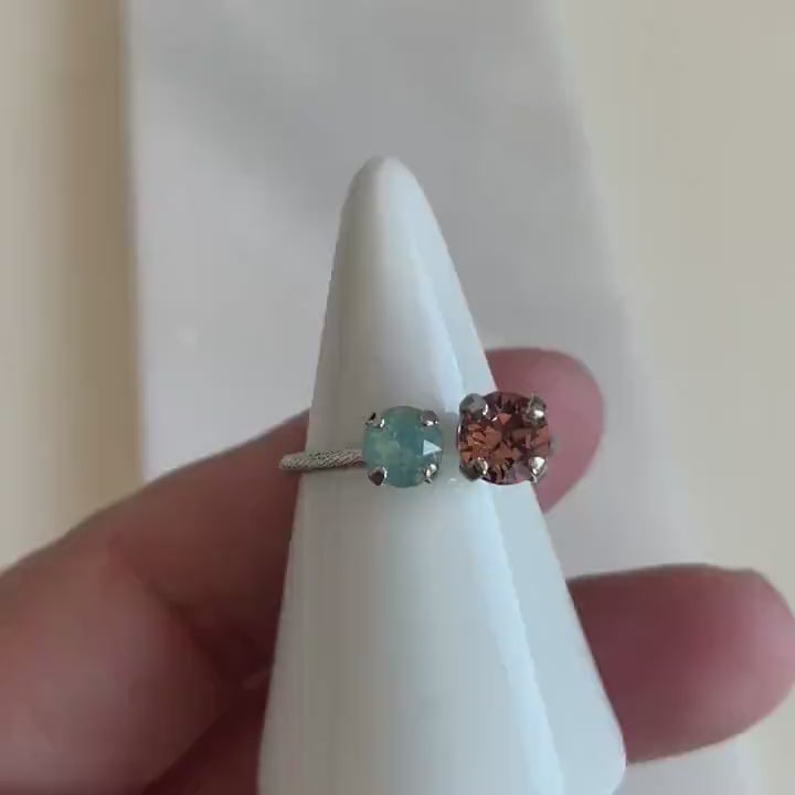 Siéntete delicado y elegante con este anillo de doble piedra. Con una banda delgada y curvada con detalles desde la talla 7,5 en adelante, está de moda. Elaborada por expertos con juegos I de cristales de Swarovski en rosa rubor y ópalo del Pacífico, esta belleza chapada en plata no contiene níquel y es muy cómoda.