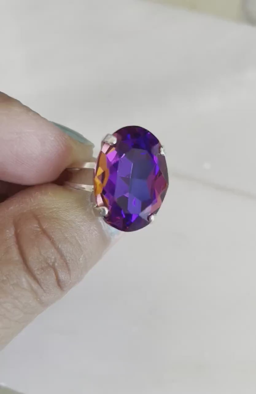 ¡Este impresionante anillo de cóctel de cristal seguramente llamará la atención! Un magnífico cristal ovalado de 18 mm está engastado en un lujoso anillo ajustable chapado en oro que se adapta a tamaños 5 en adelante. Esta gema de 12 quilates es perfecta para cualquier ocasión especial o para añadir un brillo llamativo a tu look diario. Cuando la luz lo refleja, el cristal brilla en tonos de azul, morado y rosa. ¡La base del anillo no contiene níquel!