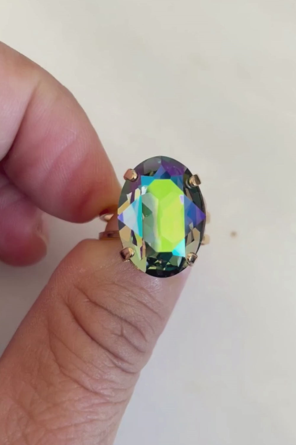¡Este impresionante anillo de cóctel de cristal seguramente llamará la atención! Un magnífico cristal ovalado de 18 mm está engastado en un lujoso anillo ajustable chapado en oro (o plata) que se adapta a tamaños 5 en adelante. Esta gema de 12 quilates es perfecta para cualquier ocasión especial o para añadir un brillo llamativo a tu look diario. Cuando la luz lo refleja, el cristal brilla en tonos violeta, azul y verde. Además, ¡la base del anillo no contiene níquel!