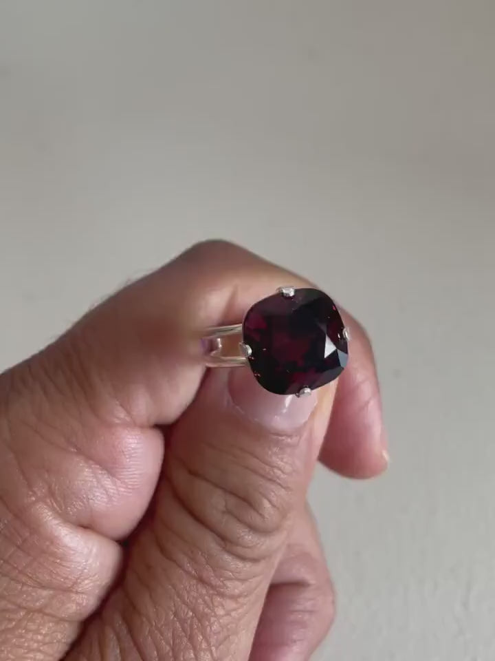 Este exquisito anillo de cóctel cuenta con un deslumbrante cristal de Swarovski, que se asemeja a una piedra preciosa. El cristal de talla cojín cuadrado de 12 mm está meticulosamente engastado a mano en un anillo ajustable plateado, que varía desde el tamaño 5 en adelante. Con un notable peso de casi 7 quilates, aporta un toque de glamour a cualquier ocasión o uso diario. La base del anillo no contiene níquel.