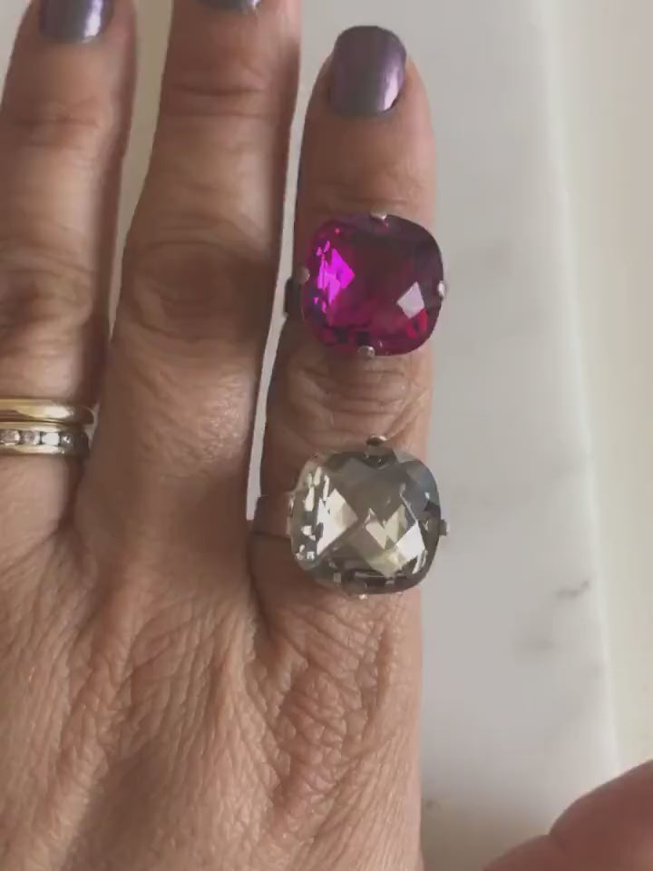 Cette magnifique bague cocktail en cristal vous coupera le souffle ! Le cristal Swarovski taille coussin carré de 16 mm scintille dans sa monture de bague réglable plaquée argent (environ une taille sept au plus petit). Présentant un joyau de près de 11 carats, vous pouvez faire une déclaration, que ce soit pour une occasion spéciale ou simplement pour ajouter un peu de bling au quotidien. Choisissez parmi Hot Pink, Silver ou Clear! La base de l'anneau est sans nickel