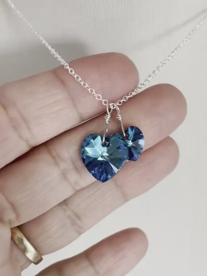 This necklace features two Swarovski crystal hearts in Bermuda blue, hand-wrapped in sterling silver wire. The larger heart is 14mm, and the smaller is 10mm, symbolizing a mother and child's bond. The hearts hang delicately on an 18" silver-filled chain, making it an affordable, elegant gift to express love and gratitude on Mother's Day or any other special occasion.