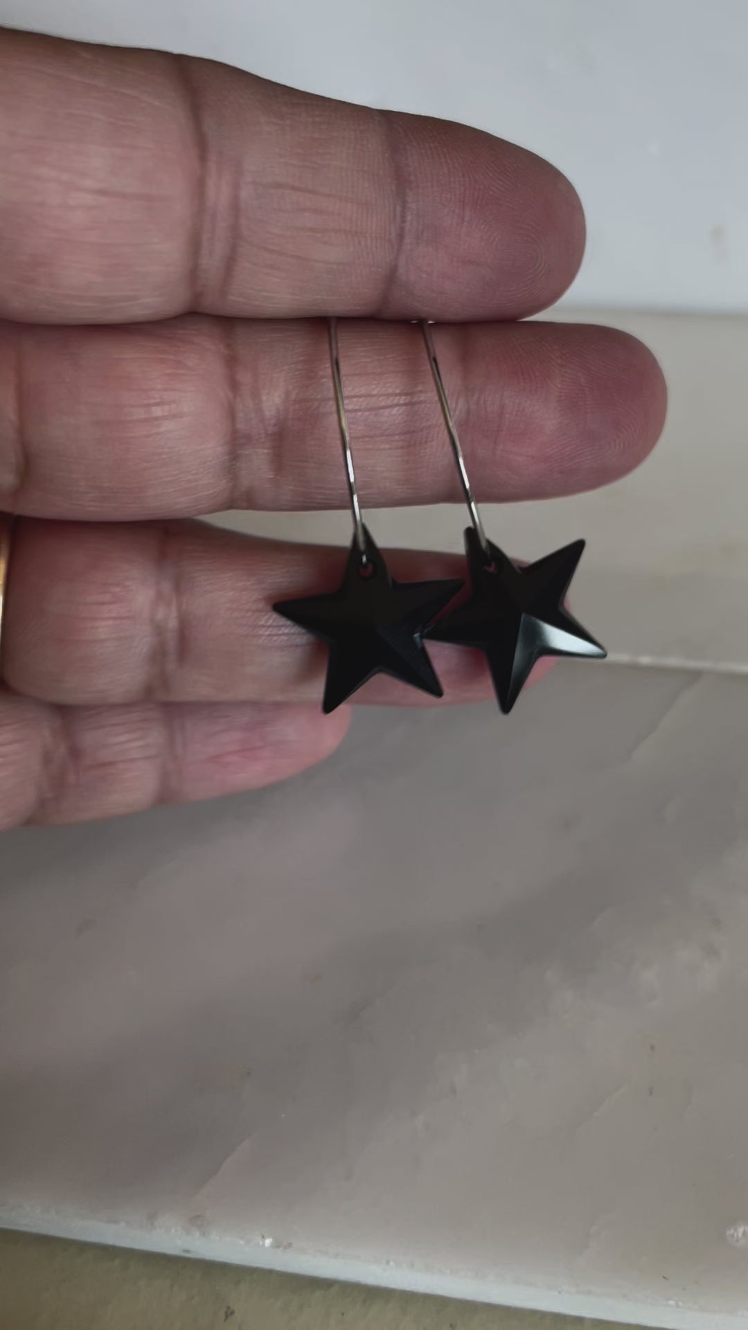 Elevate your jewelry collection with these stunning black Swarovski crystal star earrings. Featuring dazzling black crystal star pendants, each measuring 0.5" in height, these earrings exude sophistication and charm. The star pendants hang gracefully from sleek silver hoops, which add a modern touch to the design. With a total length of 1.5", these versatile earrings are perfect for both casual and formal occasions. Ideal for those who appreciate refined and eye-catching accessories, these black Swarovski crystal star earrings are a chic and elegant addition to any jewelry box.