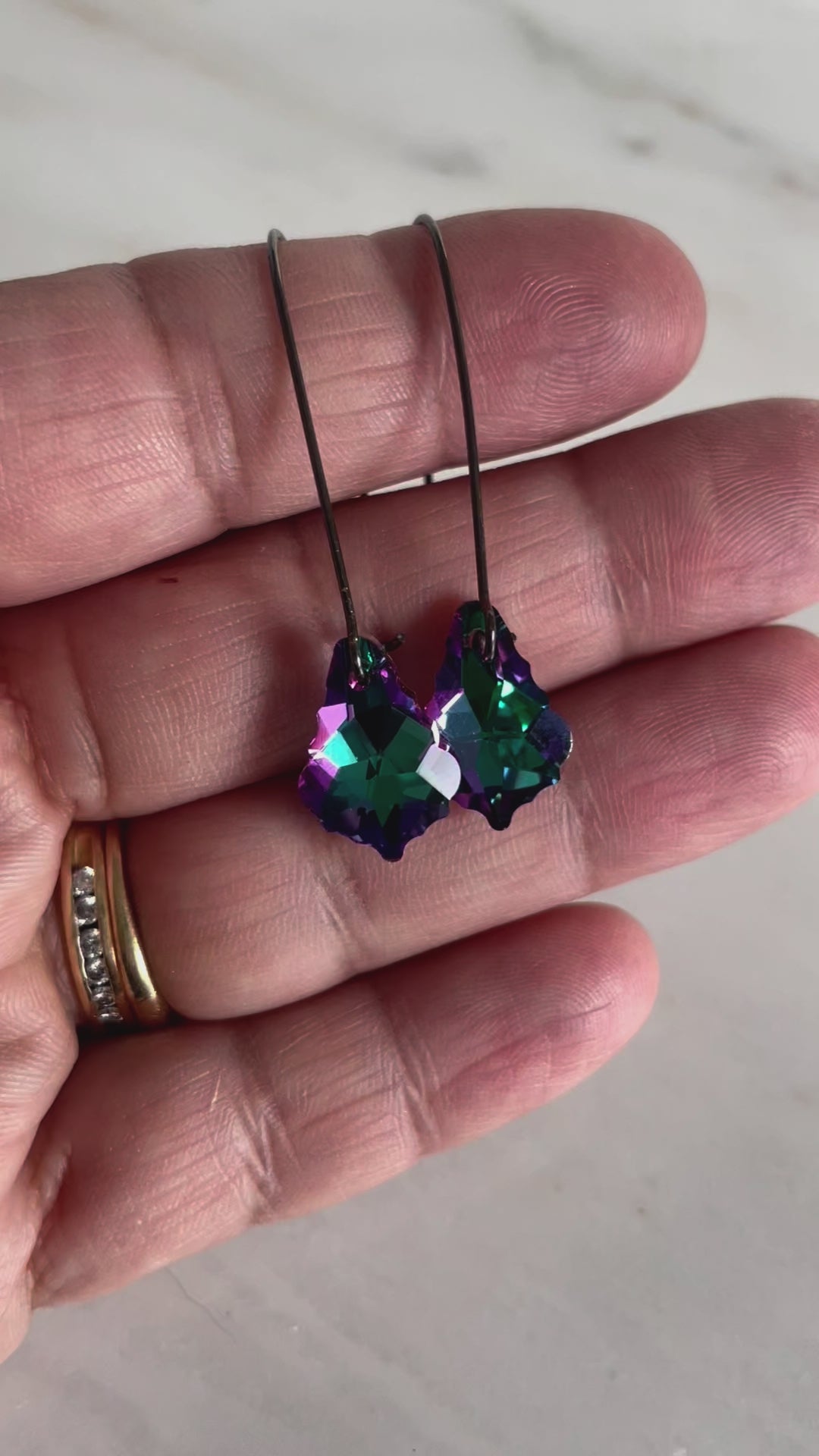 Experience the vibrant and electric hues of greens, blues, and purples with these elegant Electric Crystal Baroque Earrings. The beautifully baroque-shaped largest crystal measures 16mm and is suspended from gunmetal kidney wires, creating a total length of approximately 2 inches. Elevate your style and energy with these stunning earrings!