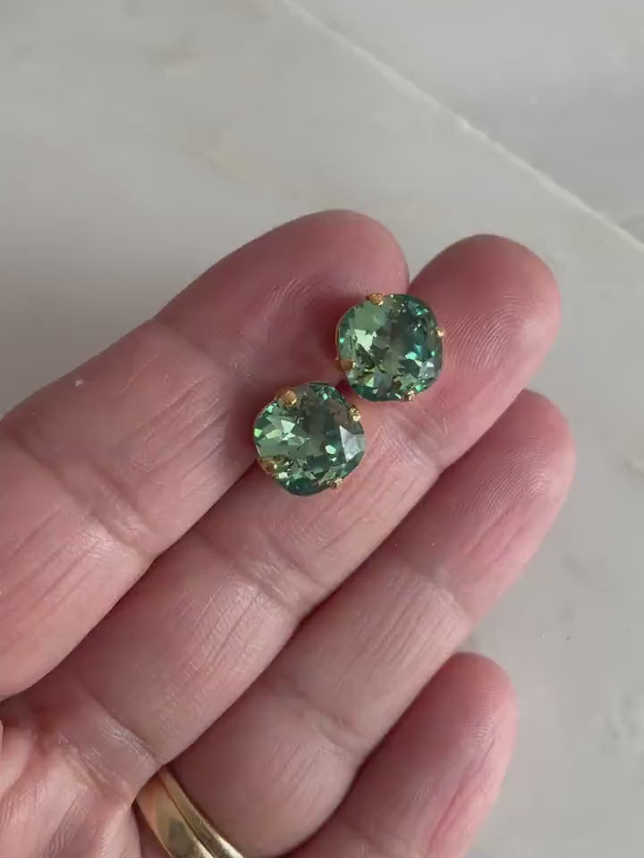 These sophisticated square crystal earrings are the perfect combination of green with a hint of blue. The color is called erinite by Swarovski, and I have a handset each 10mm (.40") square cushion stone into gold-plated posts. The nearly 4-carat crystals are perfect for a special occasion or everyday bling.