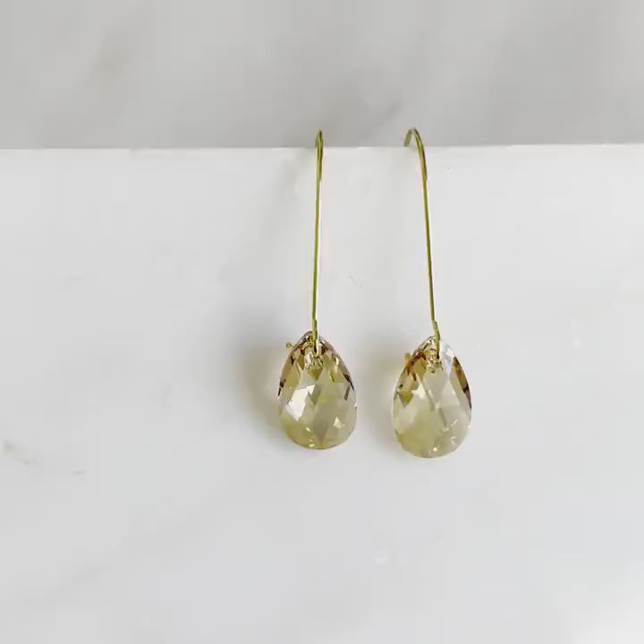 These gleaming crystal pear drops dangle elegantly on plated kidney wires for a total length of 1.75". The teardrop shape has a breathtaking shine, perfect for any occasion. A picture of the same design in a different hue is provided for reference.