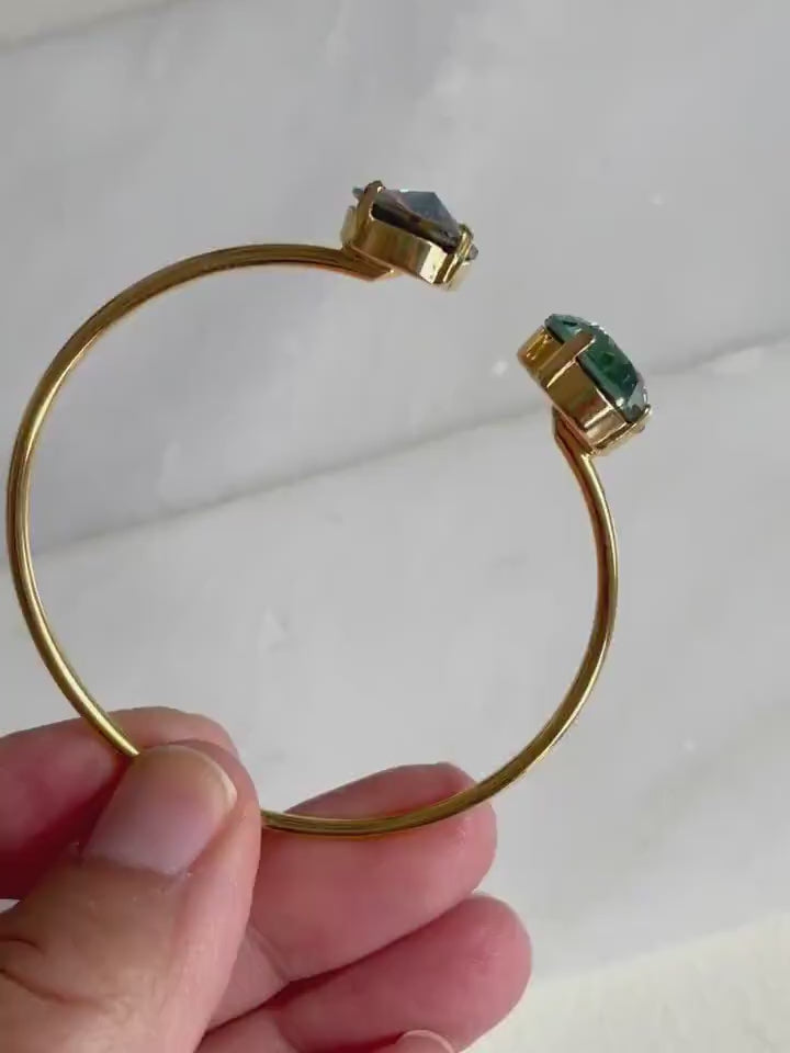 This yellow gold bangle brings your collection to life with its gleaming green-hued crystals! Stackable open cuff bracelets are the perfect accessory to make your arm candy dazzle.