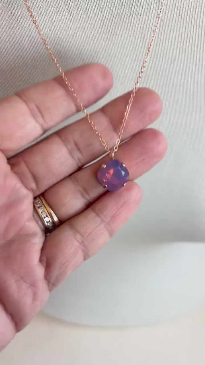 Soft, feminine, and effortlessly elegant—this Lavender Opal Square Pendant Necklace is a beautiful way to add a subtle glow to any look. The 12mm (.5") square-cut Austrian crystal shimmers with dreamy lavender tones and is set in a warm 24K rose gold-plated bezel. It hangs delicately from an 18" rose gold-plated chain, making it the perfect piece for layering or wearing solo.