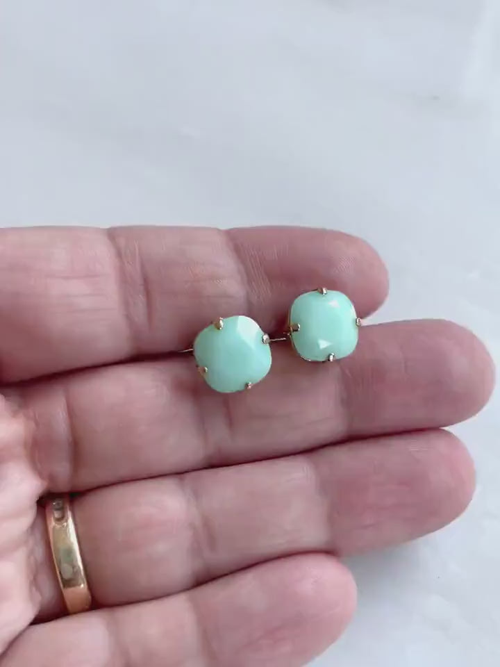 These opaque crystal earrings are the perfect shade of mint. I have hand set each square cushion Swarovski crystal into gold plated posts. The nearly 4-carat crystals are perfect for a special occasion or everyday bling. Available in 10mm or 12mm. The last picture is for sizing purposes. The video shows 10mm. It's the perfect combination of dazzle and subtlety. No matter what you pair these beauties with, you'll be sure to pull off a stunning look. Plus, you'll be ready to turn heads wherever you go!