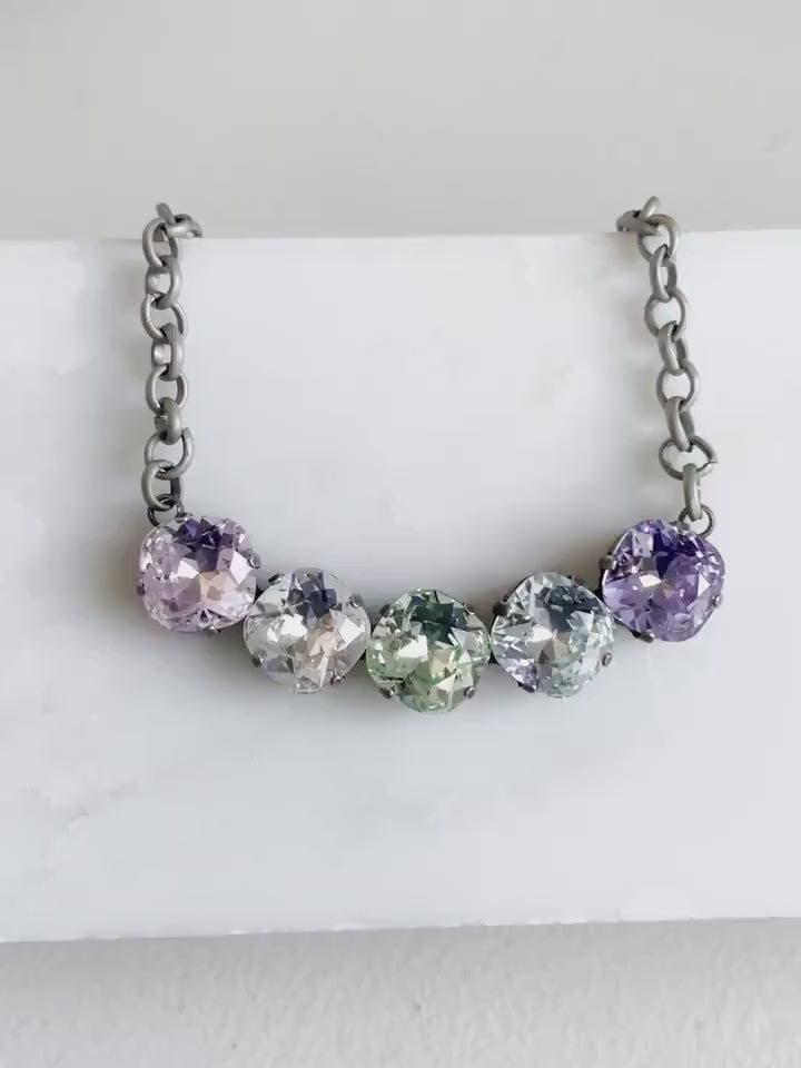 The necklace is absolutely stunning. The combination of pastel SWAROVSKI® crystals set in an antique silver pendant creates a captivating piece of jewelry. The pendant itself features five 12mm crystals in light pink, clear, light green, light blue, and lavender, which adds a beautiful array of colors.