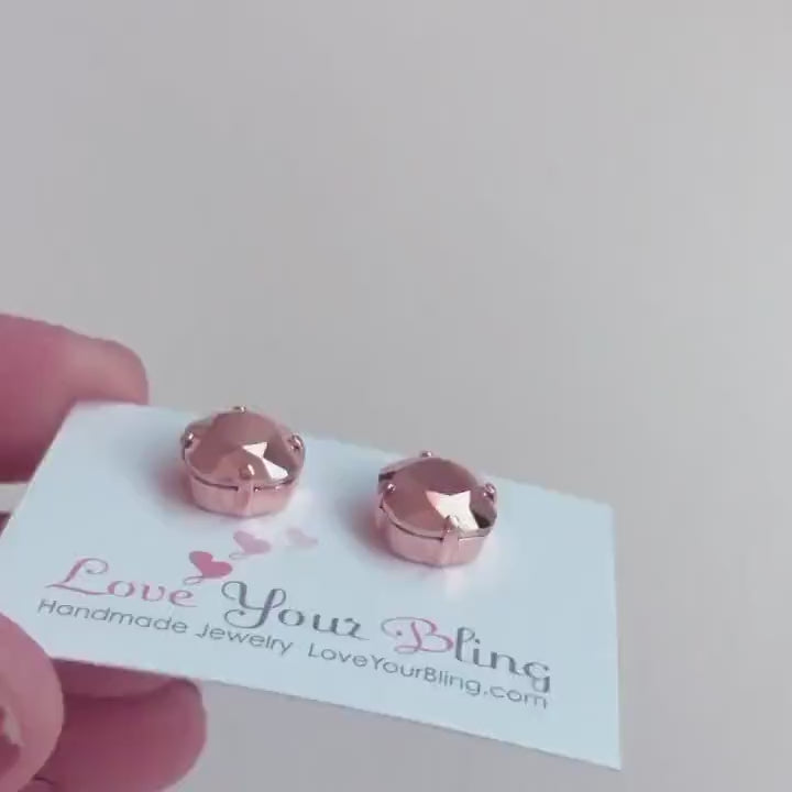 These feminine crystal earrings are in soft rose gold. I have hand set each 10mm square cushion cut Swarovski crystal into rose gold plated posts. The nearly four-karat crystals are perfect for a special occasion or everyday bling, however, this color stone is becoming harder to find. The Swarovski crystals are octagons offering incredible sparkle and brilliance, and the 4-karat stones will last and shine for years to come. High-polish rose gold plating ensures your earrings will stay tarnish-free.