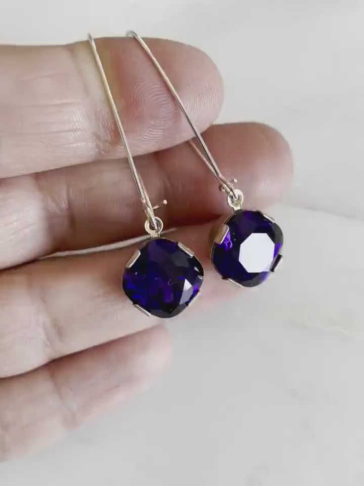 Sparkling like real gemstones, no one would guess that they are crystal! Hung on silver plated kidney ear wires are two large (.5") square Swarovski crystals in the rich Purple Velvet shade. The jewels are set in sterling silver-plated metal. These earrings add style and sophistication to any look, and make a beautiful statement piece for special occasions. The quality of the crystals ensures that they will always shine like the stars.