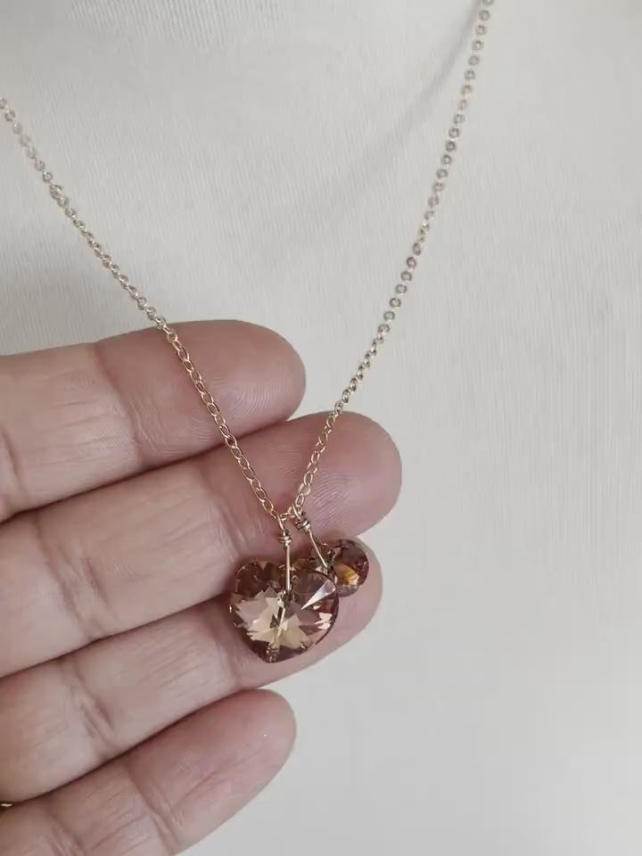 The necklace is exquisite. These Swarovski Crystal hearts are in a rare rose gold shade, it's a beautiful piece of jewelry. The larger heart, measuring 14mm, and the smaller heart, measuring 10mm, add a lovely touch to the design. The golden hearts being hand wrapped with rose gold-filled wire adds a personal and intricate detail.